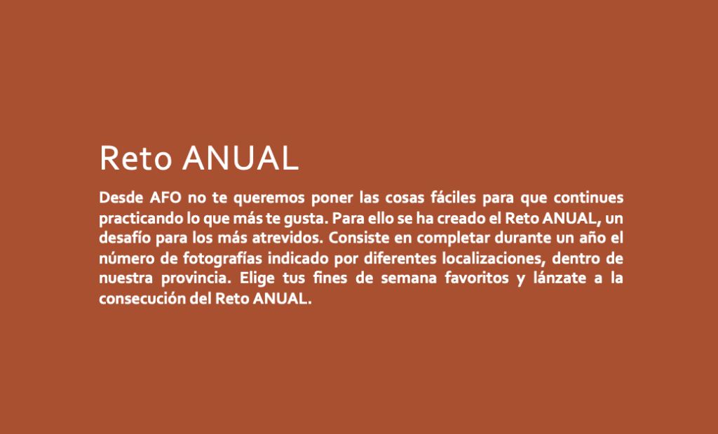 Complicamos un poco las cosas para que consigas tener otra visión de la fotografía y de todo lo que puedes llegar a conseguir. Los retos anuales son concursos temáticos diseñados para fomentar la disciplina, creatividad y participación de los socios.